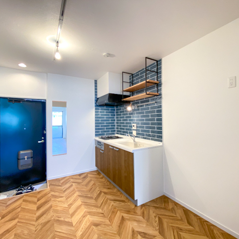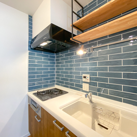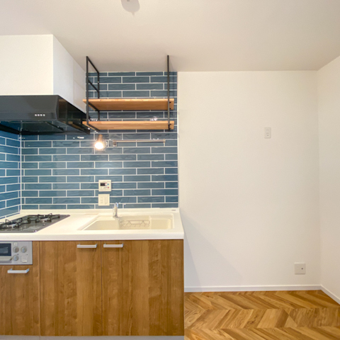 ブルーのキッチンタイルと、まるで外国のお部屋みたいに可愛い。