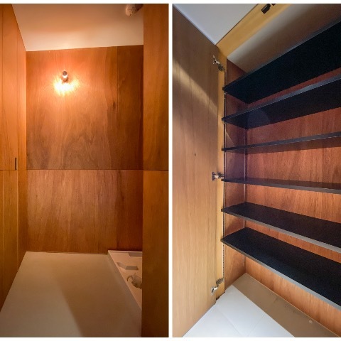 木の壁に囲まれたこの通路の中に、ランドリー・サニタリー・収納が全部隠れてるんです。