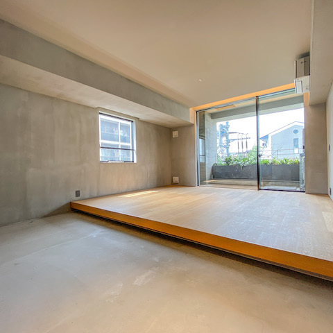 壁で仕切らず、段差で空間を分けているので、視線が抜けてとにかく広く感じる。