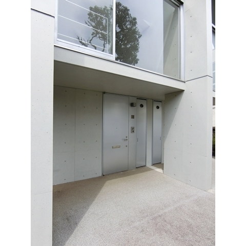 共通ゲートはオートロック、くぐるとガラスとコンクリートの現代建築。