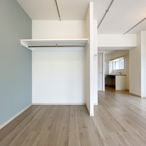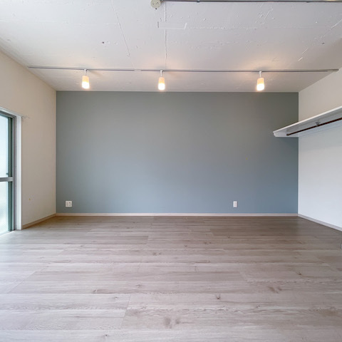 天井はコンクリート白塗り、水色の壁紙、薄めのフローリングで統一感もあって、