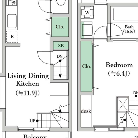 住戸は1階に玄関を構え、室内階段で上下階へとつながるメゾネットタイプ。