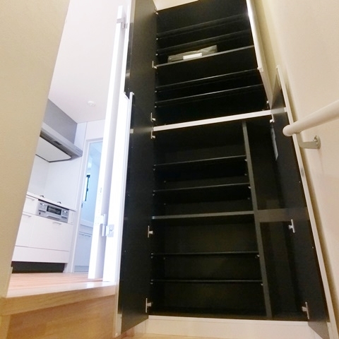 玄関階段上には大容量のシューズクローゼットが設けられており、靴だけでなくアウトドア用品などもすっきり収納可能。