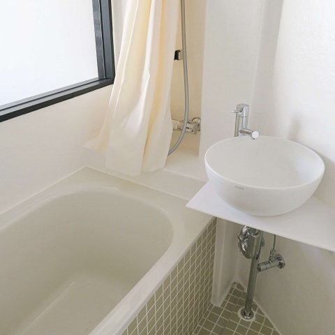 バスルームを大胆にガラス張りにすることで圧迫感を軽減したり、洗濯機をキッチン下に設置することで限られたスペースを有効的に使えるようになっています。