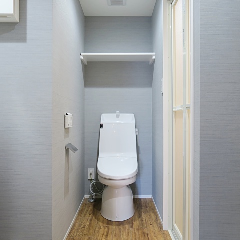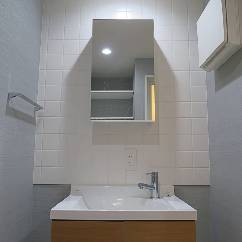 ブルーグレーのクロスが大人お洒落な水回りは