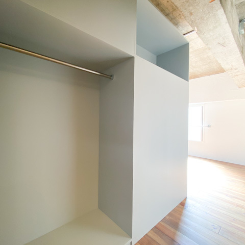 サニタリーと部屋を仕切る収納は、服を掛けるスペースも十分にあり、かつ空間を閉塞感なく分けられる最適の解かと。