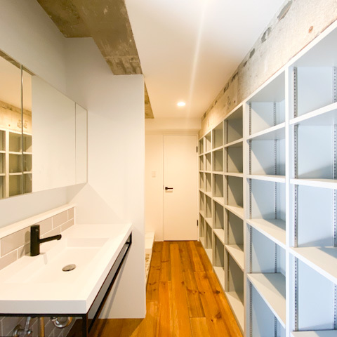 たっぷりとスペースのあるサニタリーは、棚がずらっと並んでおり、抜かりなく収納&ディスプレイ可能。