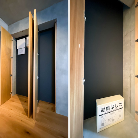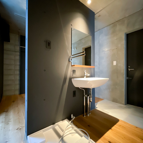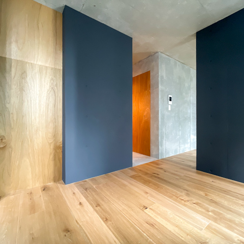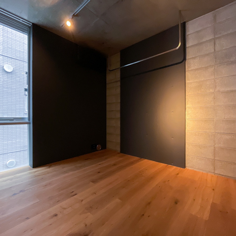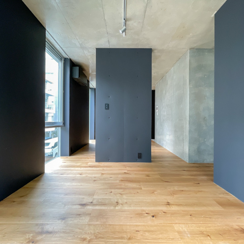 黒の壁や打ちっぱなしのコンクリート壁、オーク木材のフローリングは