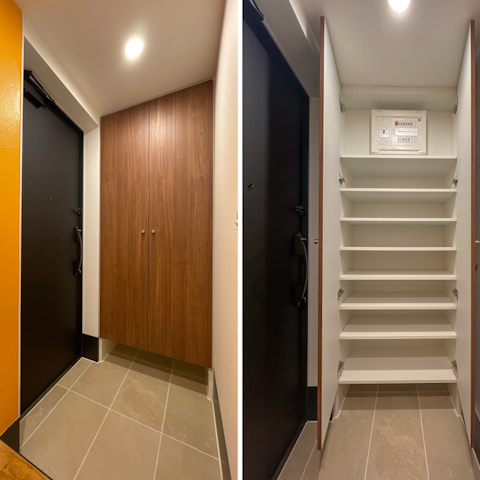玄関を入ると印象的なオレンジの壁紙が。玄関が明るいと晴れやかな気持ちになりますよね。