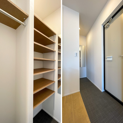 大容量のシューズボックスと姿見も備わっていて、玄関まわりも整えやすくなっています。