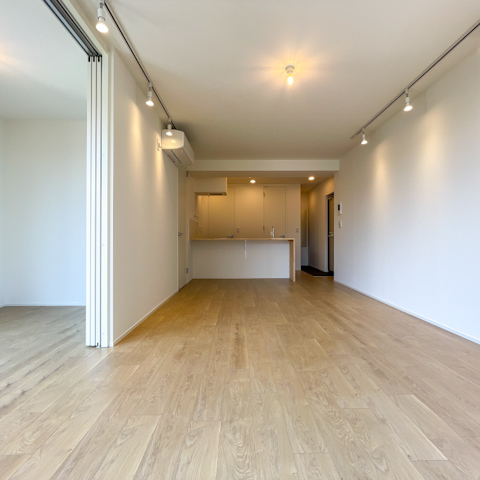 その奥に広がる約15.5帖のLDKは、ナチュラルな無垢床が敷かれた優しい空間。