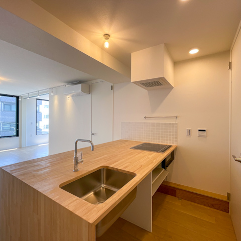 室内に入ると、まず目を引くのが造作カウンター付きのキッチン。