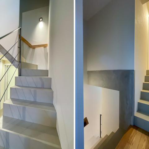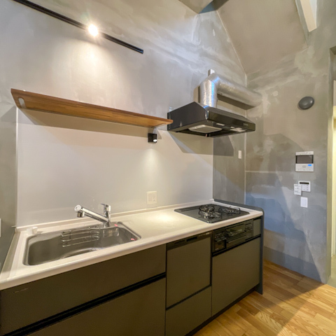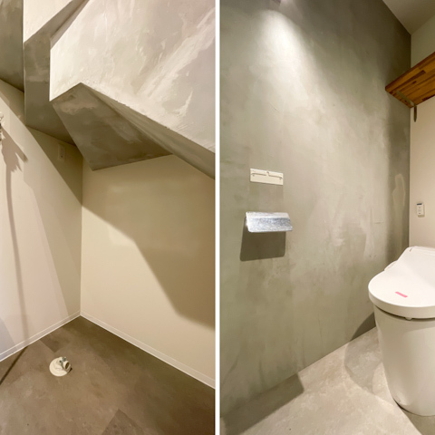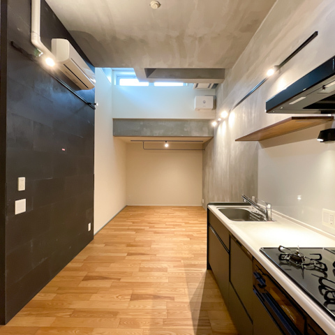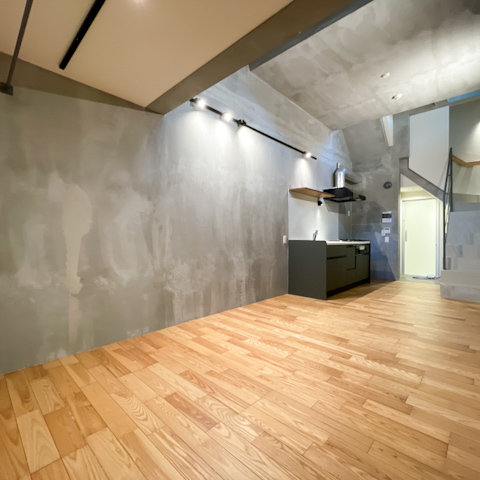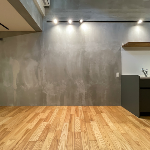 モルタル調の壁にナチュラルなフローリングが組み合わさり、スタイリッシュな中にあたたかみも感じられる空間に。