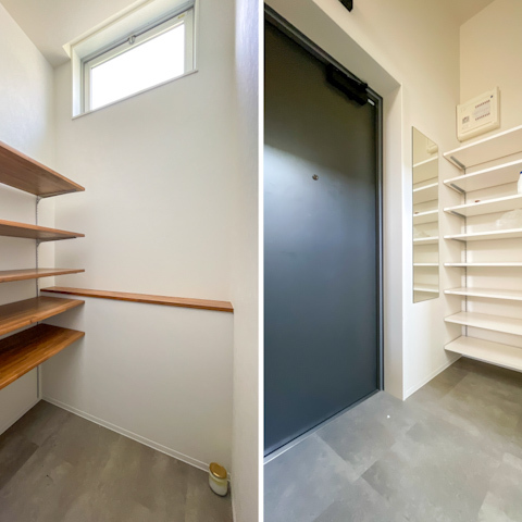 玄関周りもゆとりがあり、シューズクローゼットのほかにストレージルームも完備。