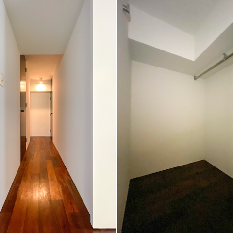 玄関から続く廊下には寝室とDENスペースが並び、DENにはハンガーラックも備え付け。