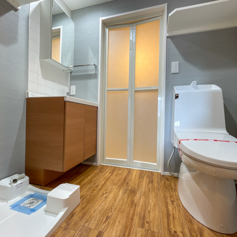 水回りはブルーグレーのクロスがアクセントになり、