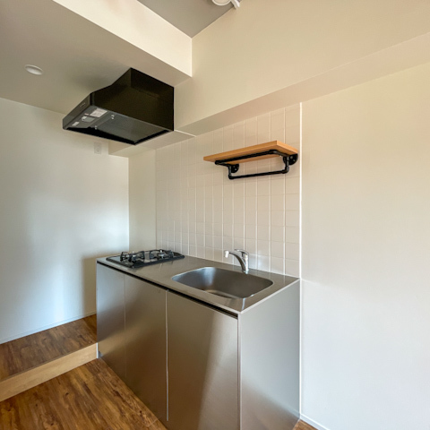 キッチンは2口コンロのコンパクトな機能派タイプ。