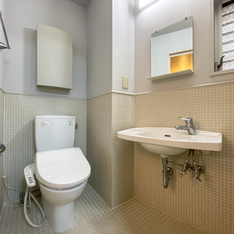 ベージュ系のタイルで仕上げられたサニタリー空間は、温かみと清潔感が共存。