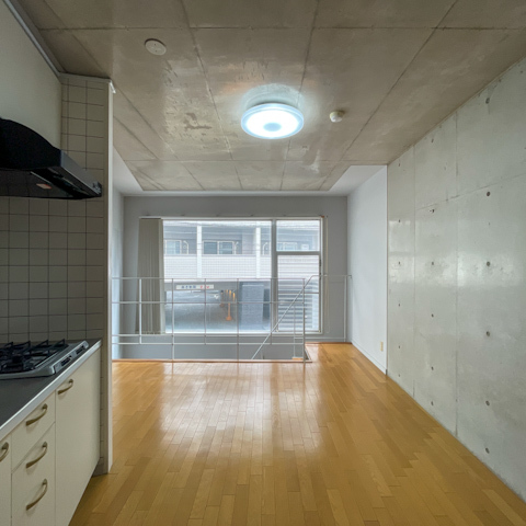 ナチュラルなフローリングと打ちっ放しのコンクリートがやわらかく照らされます。