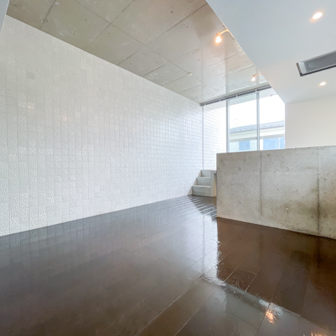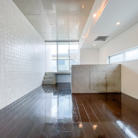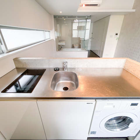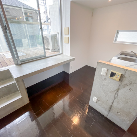 対面キッチン側面の素材もコンクリートでお洒落です。