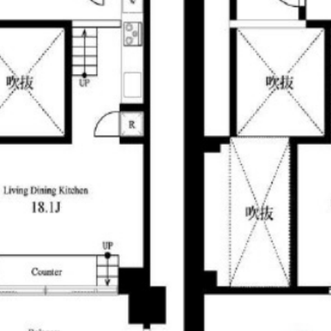 下階には約18帖の広々とした1LDK、上階には6.6帖の寝室と大容量のクローゼット、水回りを配置。
