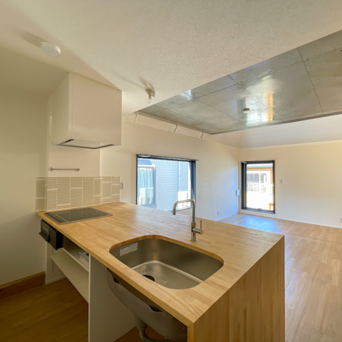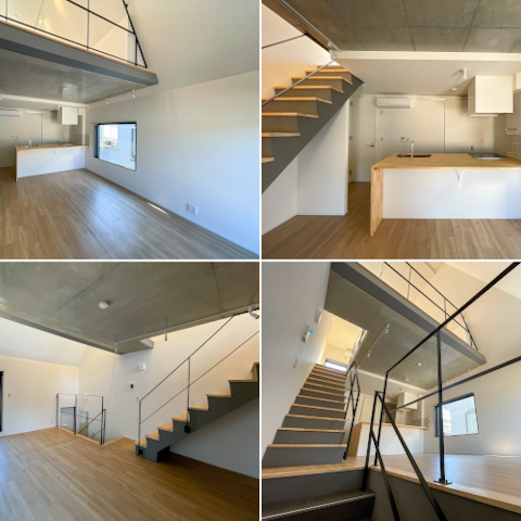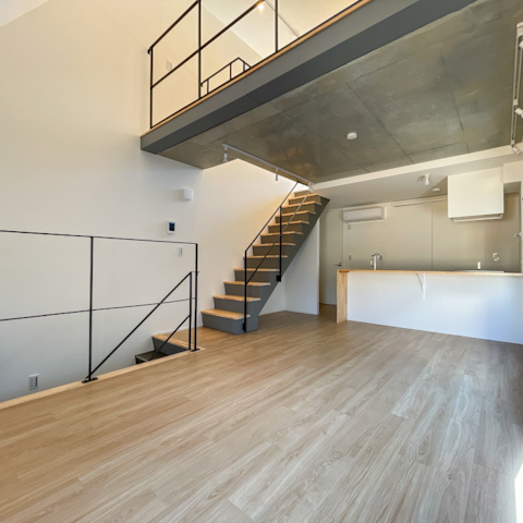 内装はナチュラルなフローリングに、天井のコンクリートがほどよいアクセント。