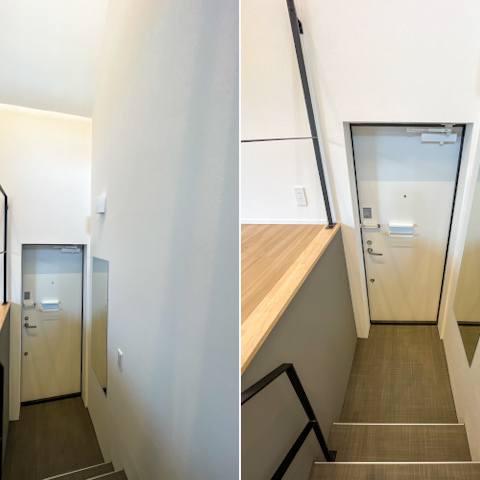 玄関を入るとすぐに階段があり、あえて収納を設けないことで、潔くミニマルな印象に。