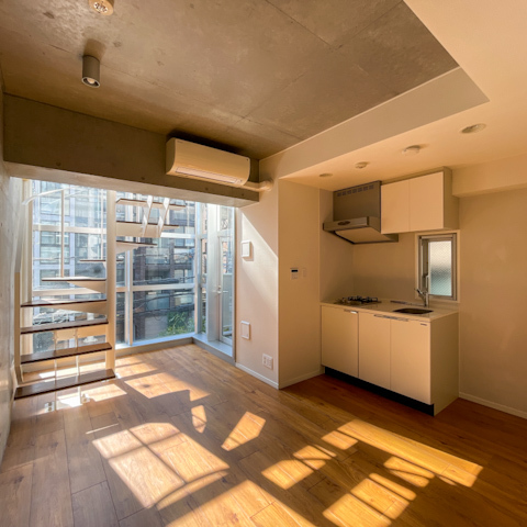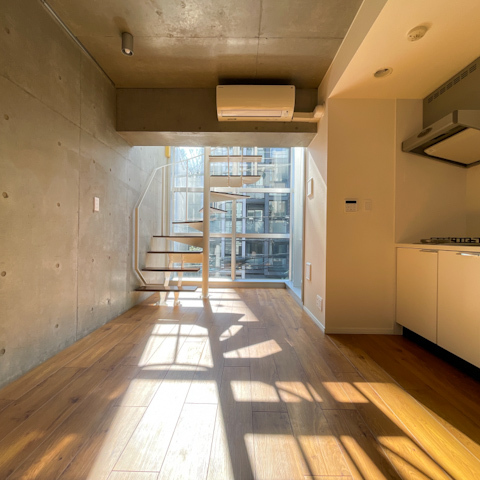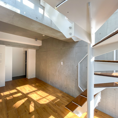 階段を上がった4階に水回りと6.6帖の洋室という、立体的なメゾネット構成。