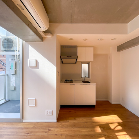 内装は白を基調に、打ちっぱなしコンクリートをアクセントにした都会的なデザイン。