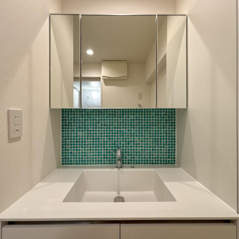 エメラルドグリーンのタイルがさりげなく効いていて、いいアクセント。