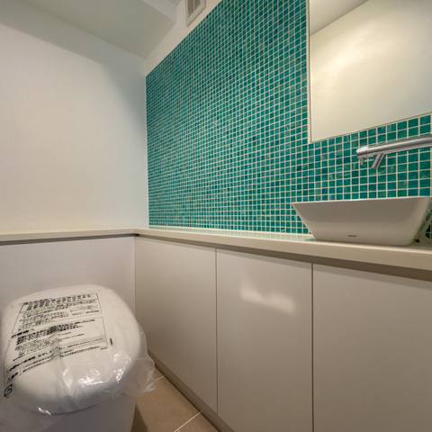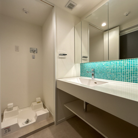 洗面台のエメラルドグリーンのタイルも、さりげないアクセントで素敵で、
