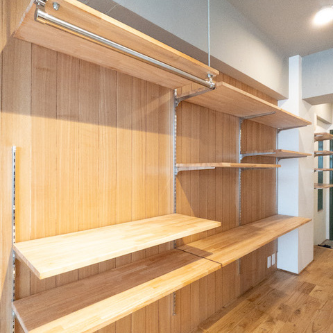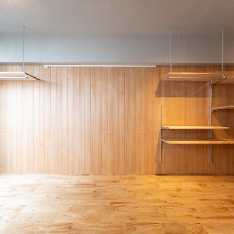 ■天井は躯体表し、床は深みのある色味のチーク材を使用して大人な雰囲気に。