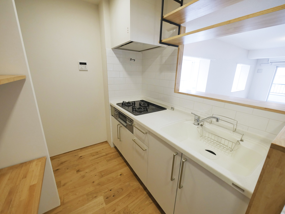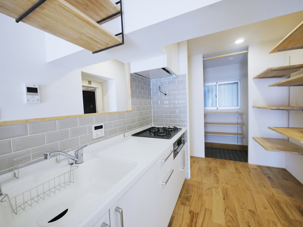 家族とのコミュニケーションを重視し、オープン型の3タイプのキッチンをご用意しました。天板はメンテナンス性も考慮した人工大理石仕様とし、壁面は各部屋毎で異なるカラーバリエーションでのタイル貼仕上げです。
