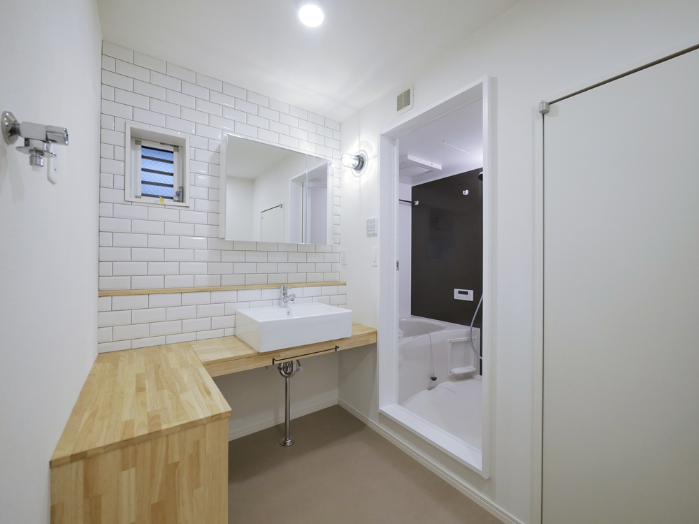 水回りも広々と快適に。タイル貼仕上げの明るい洗面スペースは収納力も十二分。